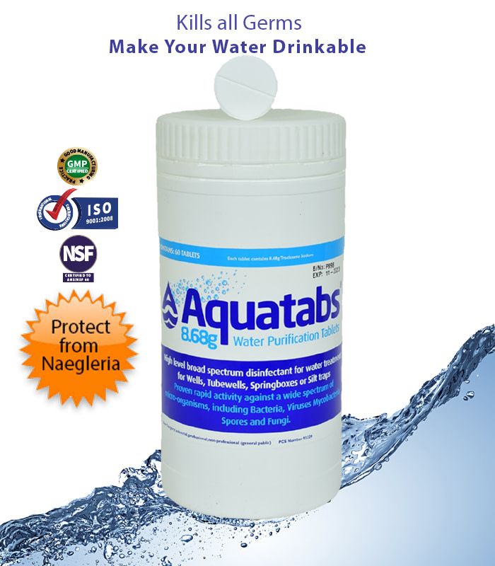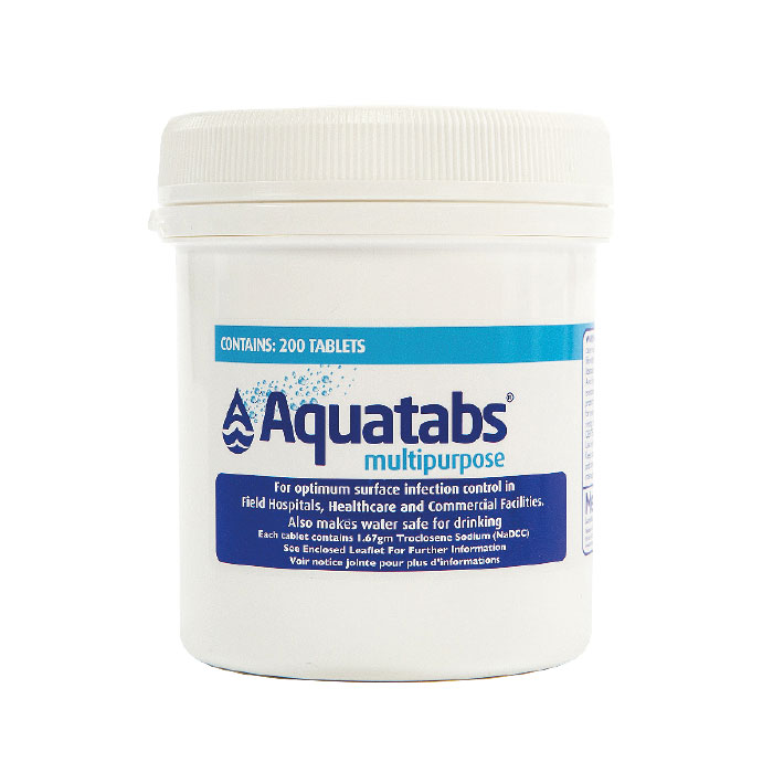 When added to water, Aquatabs effervescent and dissolve quickly to release chlorine and kill pathogens over a 30 minute period. Aquatabs kill microorganisms in water to prevent cholera, typhoid, dysentery and other waterborne diseases.